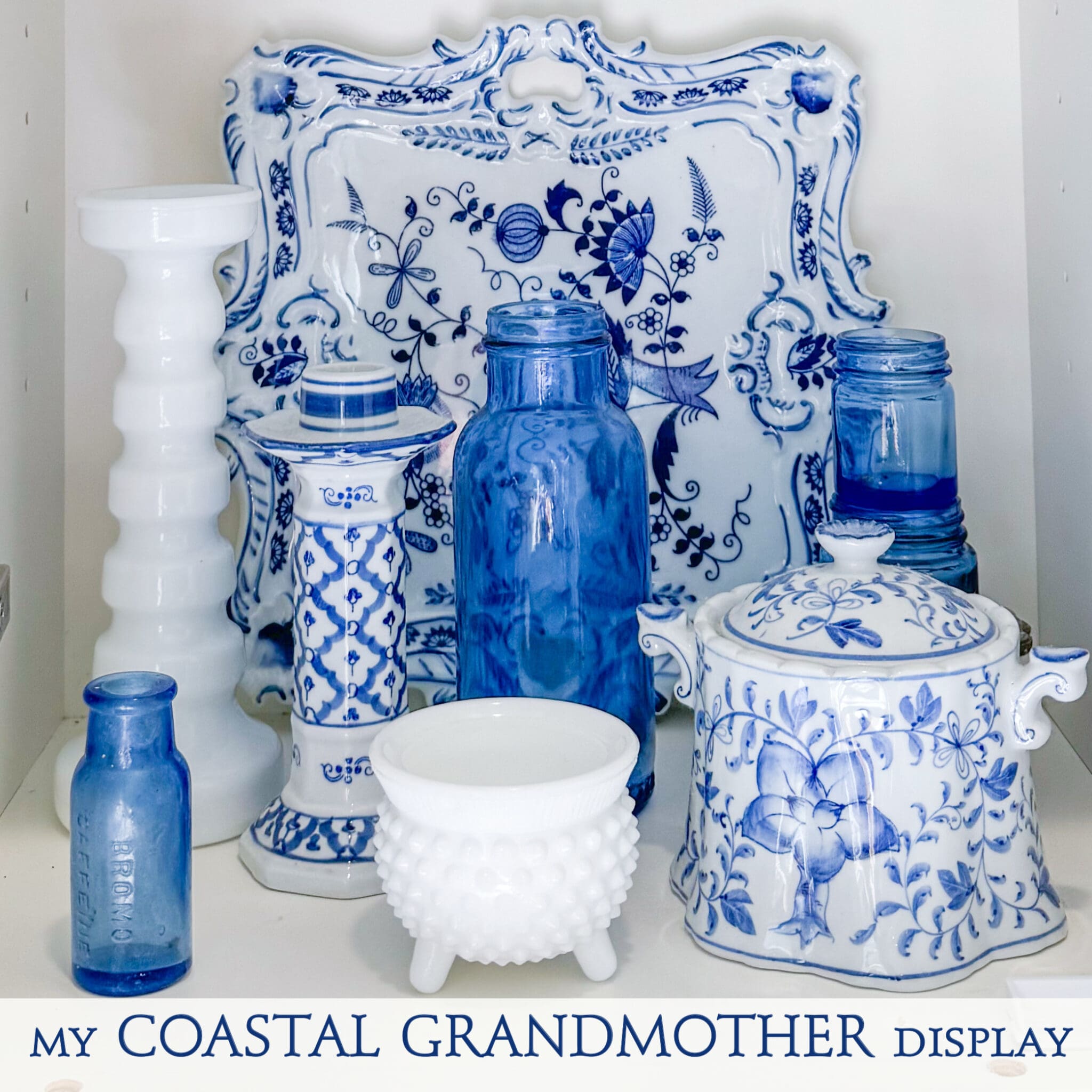 This antique Milk Glass footed bowl features a sweet laced edge! Perfect for sea shells, trinkets, candy or display. In my Coastal Grandmother collection, I used a combination of blue & white dishes, Cobalt Blue glassware and Milk Glass like this!