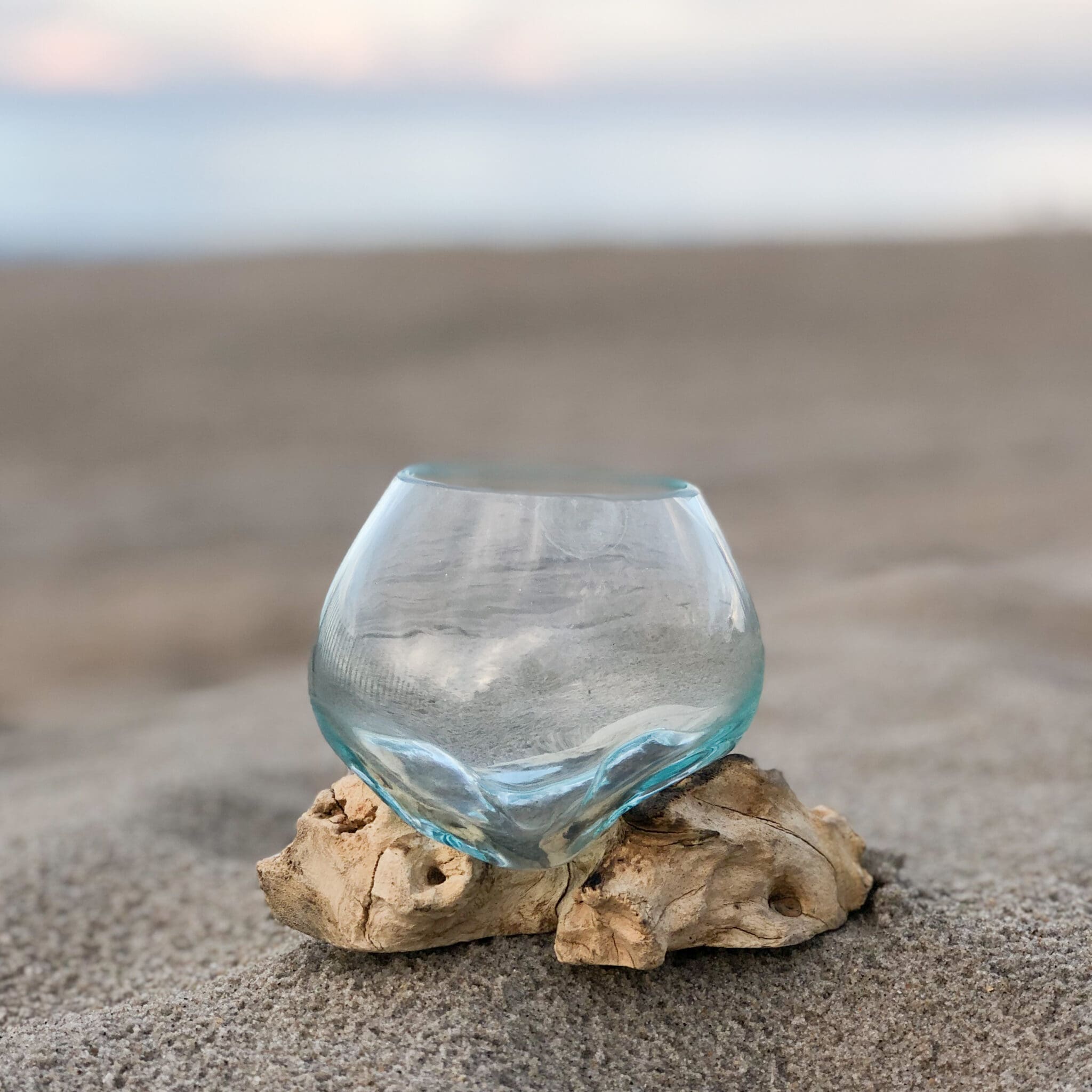 Blown glass bowl on a driftwood stand! Each piece is one of a kind. The bowls are melted for a perfect fit on the driftwood stand and they make perfect succulent planters, terrariums, flower vases… or a candy corn dish as seen in the photo!